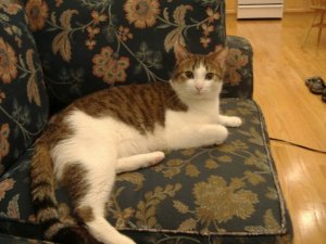 I met him in January of 2007 and spent four beautiful months with him. At night, he would come and cuddle me on the couch; when I couldn’t sleep, I would lay my head on his stomach and just listen to him breathe. He played Monopoly with us, moving the hotels around with his paws and sitting in the box. He loved to eat tuna; whenever Emily and I made tuna melts, we would save him some tuna and he would eat it eagerly. He loved his catnip toys. He loved people, loved guitar hero, loved purring and jumping around, loved sneaking into Becky’s room to hide under her bed.