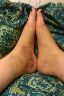 The swelling on my ankle is not going down. I am in considerable pain, but not enough to hinder mobility (sort of…) This injury is the result of a soccer game with friends and then a bunch of Chicagoans in the park on Saturday. A kid wearing glittering cleats (thus his new name, Glitter Cleats) kicked me, right before being yelled at to take it easy on the girl. That upset me, obviously, and it didn’t bother me until I looked down and saw the emerging mass that had become my ankle.